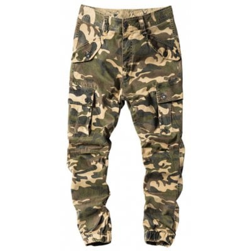 Camouflage cargo pants in cotton blend with side pockets, back pockets and leg pockets with a flap and button, seams at the knees and elastic hems. It's a good choice to work and have outdoor activities. Match it with jacket and Martin boots, showing the design of fashionable and generous.