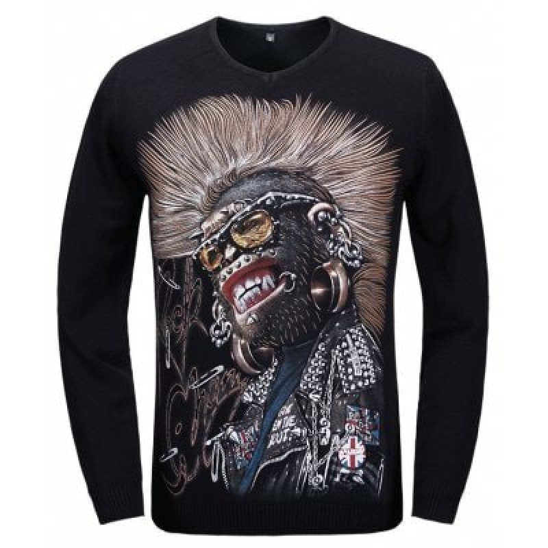 Cool Punk Monkey Pattern V Neck Long Sleeve Sweater